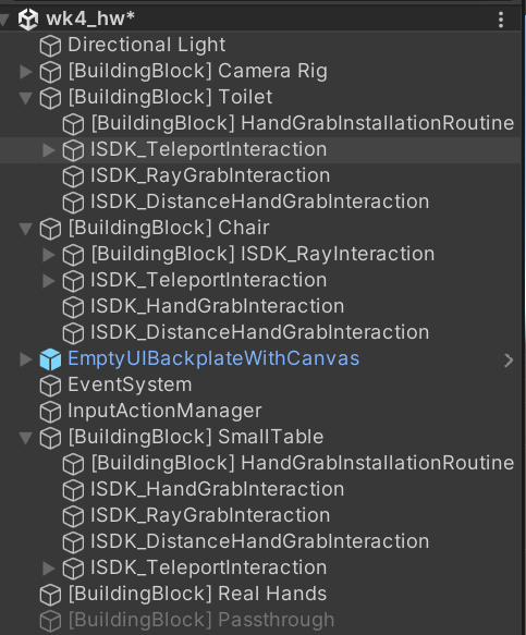 I placed three interactive objects (a table, a chair and a toilet) I applied hand grab, distance grab, ray grab Interaction SDK, as well as TeleportInteraction ISDK to make each item into a portal.