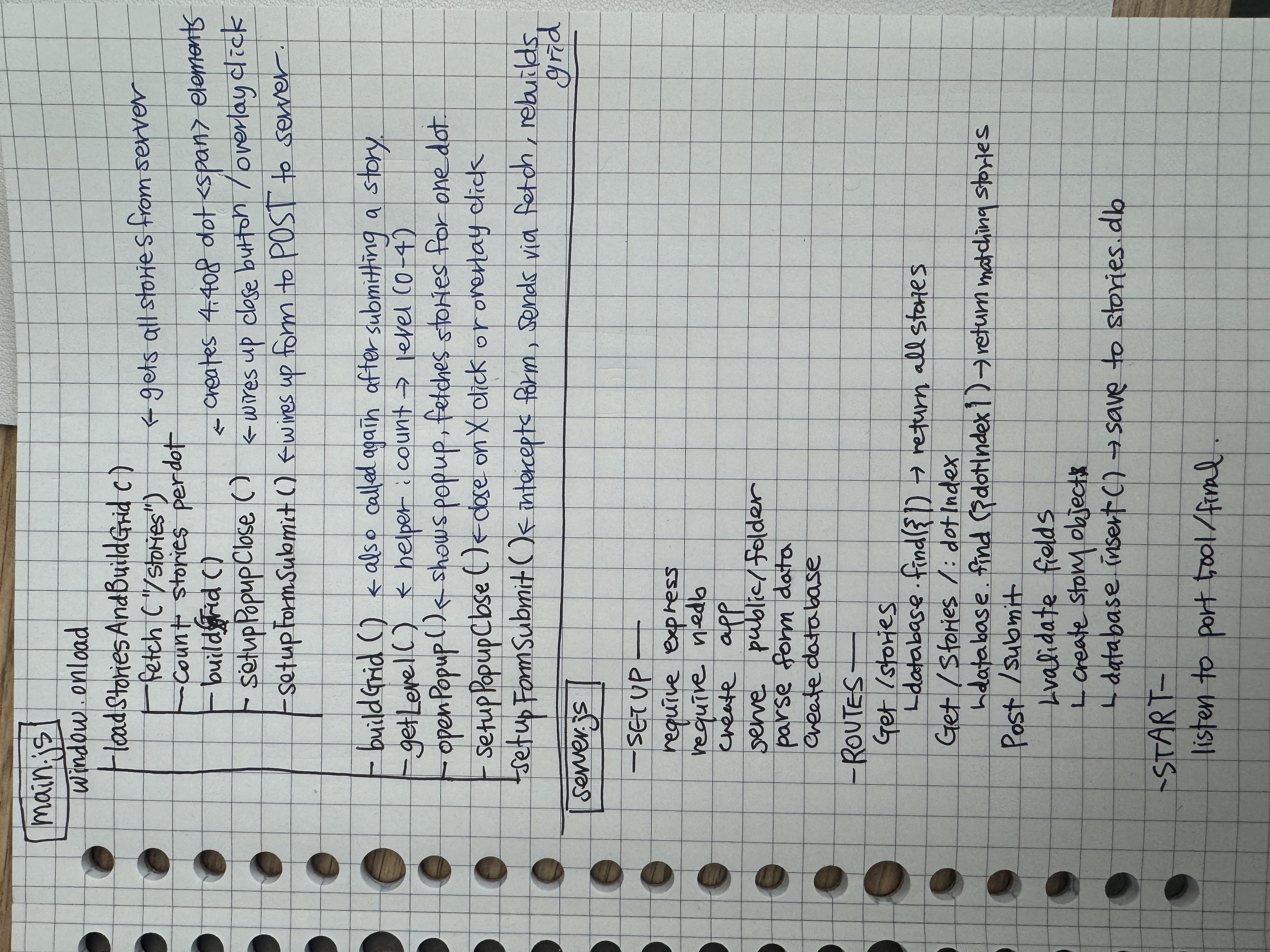 main.js loads → window.onload fires → fetch(“/stories”) → hits app.get(“/stories”) → Server queries database for ALL stories → Sends back JSON → main.js counts stories per dot → builds the grid