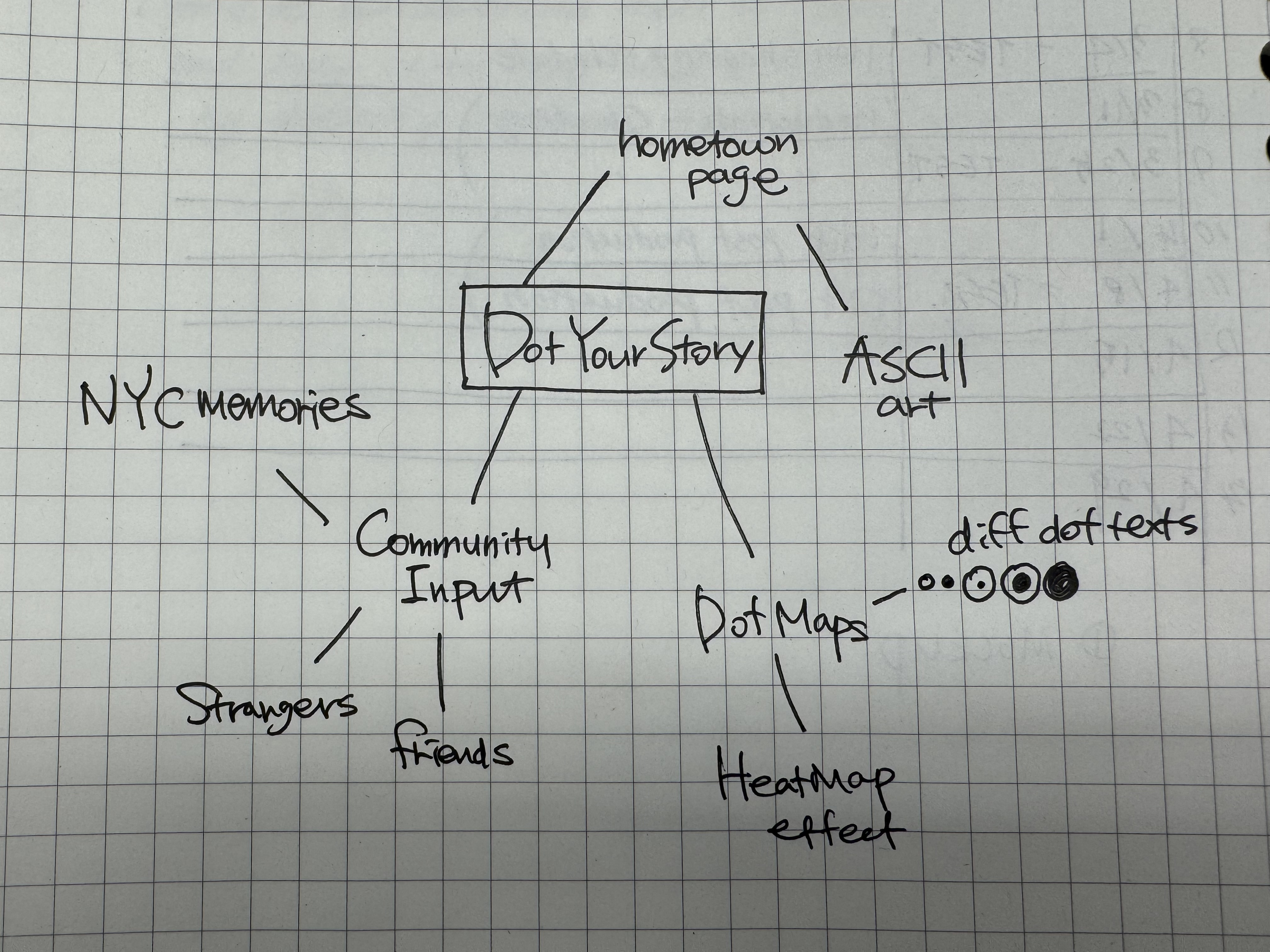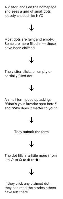 “Dot Your Story” is a community-driven website where visitors leave their personal NYC stories on an abstract dot grid of the city. The page starts as a field of empty dots, loosely arranged in the shape of NYC. When you click on a dot, you can claim it by sharing your favorite spot in that area and why it matters to you. Each time someone claims a dot, it fills in a little more — going from a faint outline to a solid filled circle. Dots that many people have claimed become bolder and darker, showing which parts of the city hold the most stories.